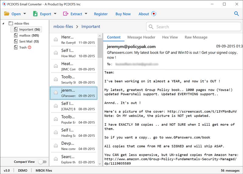 PCDOTS MBOX to EML Converter software is capable to preview MBOX files inclusive of all email messages, attachments, header, text, date, time, year, Month, subject, signature, etc. It also has an inbuilt option to preview MBOX emails in different type’s i.e. Message Header, Hex View, Raw Message, and Normal View.