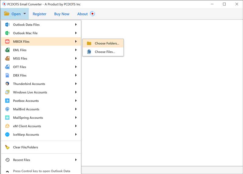 - First of all download free MBOX to EML Converter setup and install it on your Windows Computer. Start the tool and click on the Open >> MBOX Files >> Choose Folders for uploading MBOX mailbox files in the software panel.