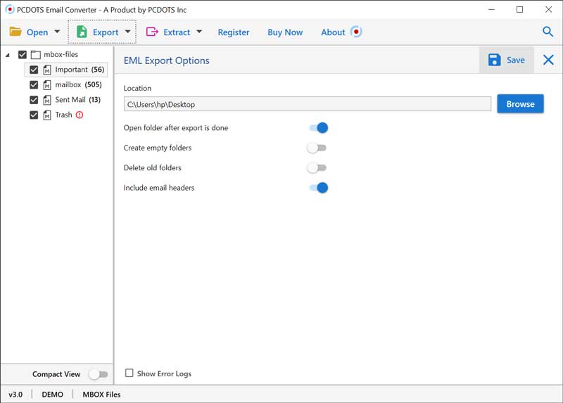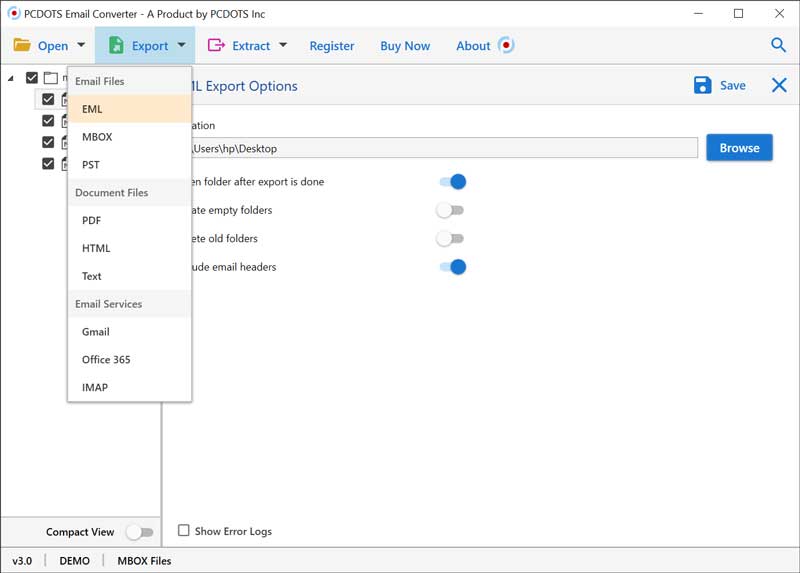 - After that press, the Export button from the software menu bar and choose EML from the list of saving options. Browse a destination path to store output EML files and click on the Save button to start MBOX to EML conversion process.